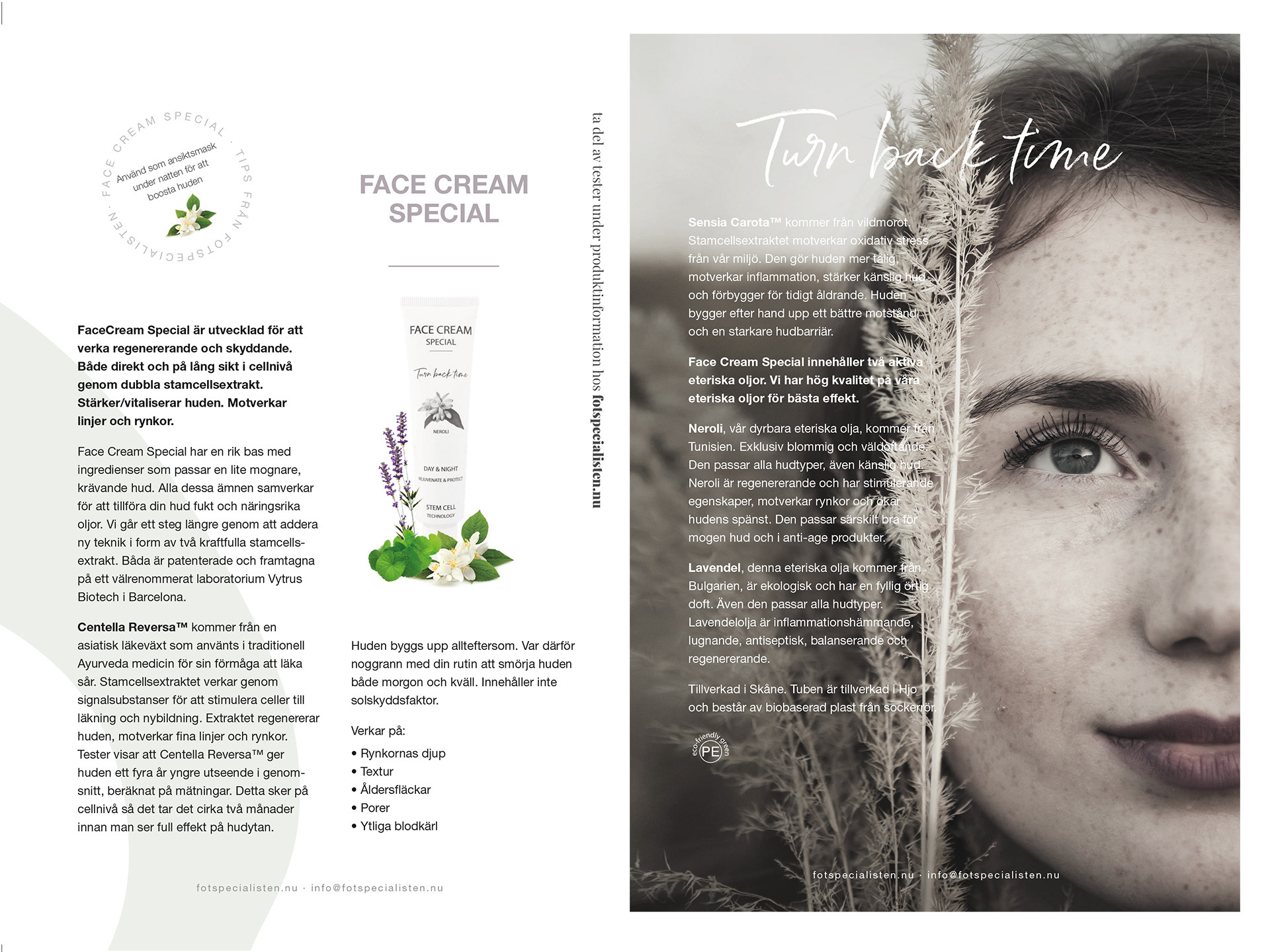 Uppdrag från Fotspecialisten. Skapa en ny förpackning till Face Cream Special, upplaga 5000 st. Film anpassad för sociala medier för Face Cream Special. Produktblad A5 dubbelsidigt, upplaga 3000 st.